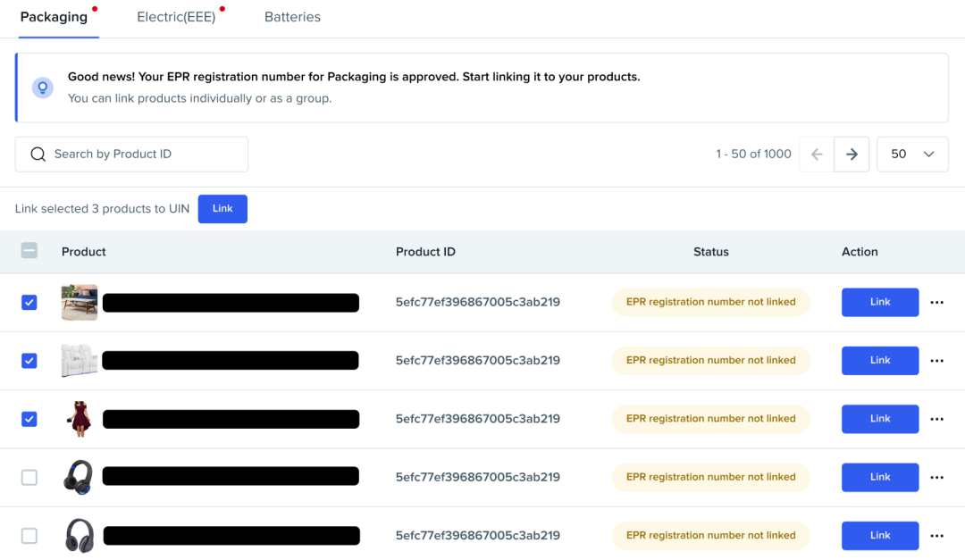 ♻在提交 EPR 注册号且“状态”栏显示“已批准”后,卖家可以在下方“受影响的产品”部分按类别将 EPR 注册号关联到产品。在“受影响的产品”部分,每个类别标签页之下将自动显示适用的产品。