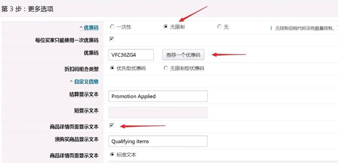 ②无限制促销码(一般站外使用的),系统会推荐一个促销码,(自己看情况是否需要点 “每位买家只能使用一次优惠码”)