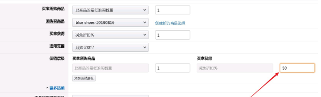 买家获得“那里选择”减免折扣%“,后面框框填的对应数字就是你要减免掉的百分比。比如填50,就意味着50% OFF的折扣力度。