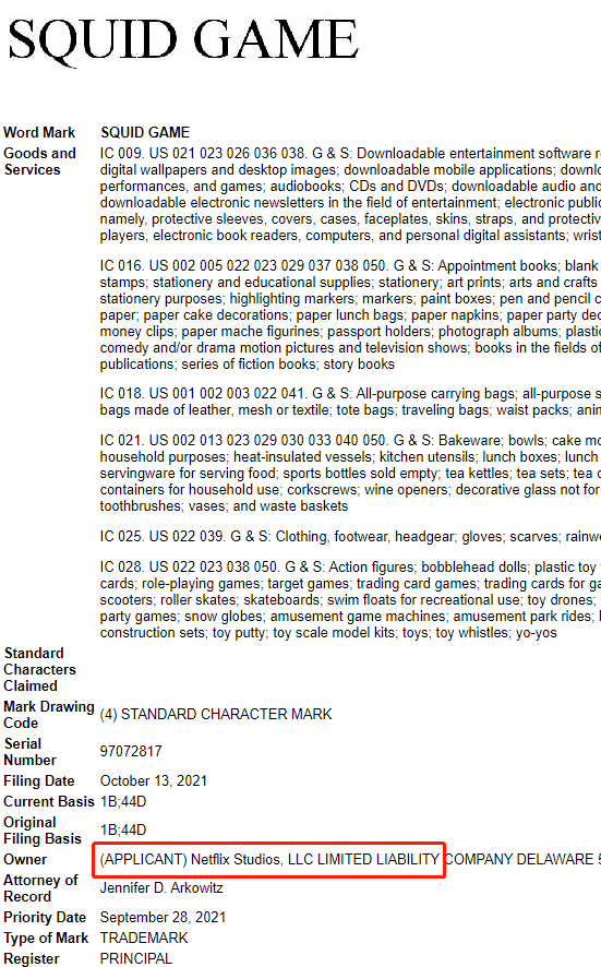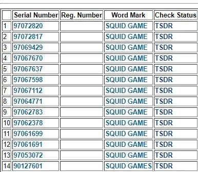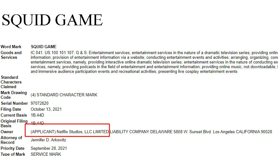 经美国商标局查询发现,在《鱿鱼游戏》播出后,有多个SQUID GAME商标提交申请。