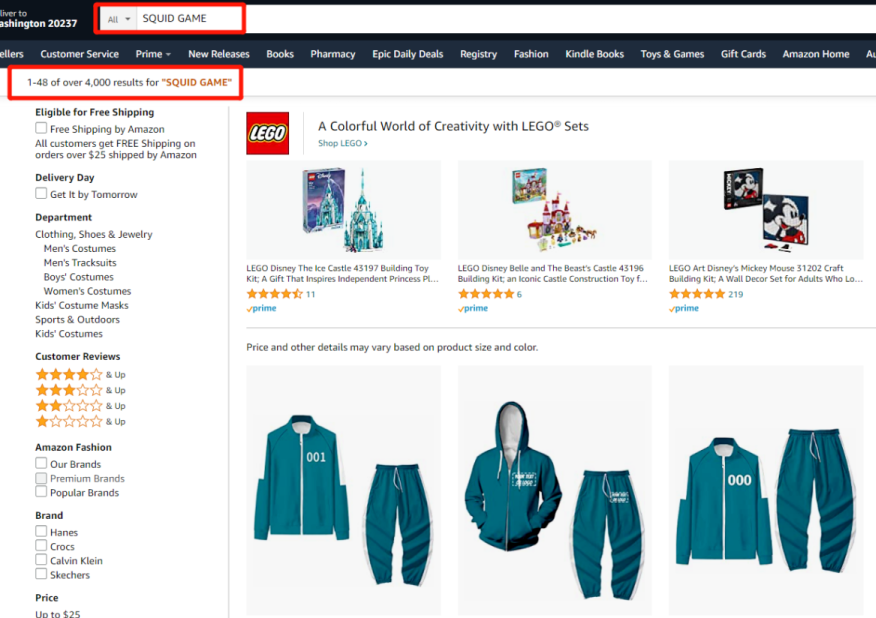 亚马逊平台上单美国站点关于“鱿鱼游戏”(SQUID GAME)就多达4000个链接。