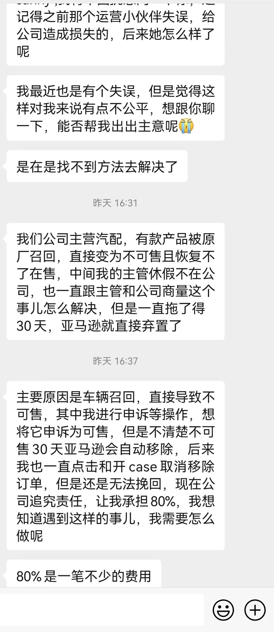 作为运营,一直在申诉,希望能够将产品变成可售,刚好这个期间,更有经验的主管休假了,一直有通过线上和主管+公司去商量该如何解决问题