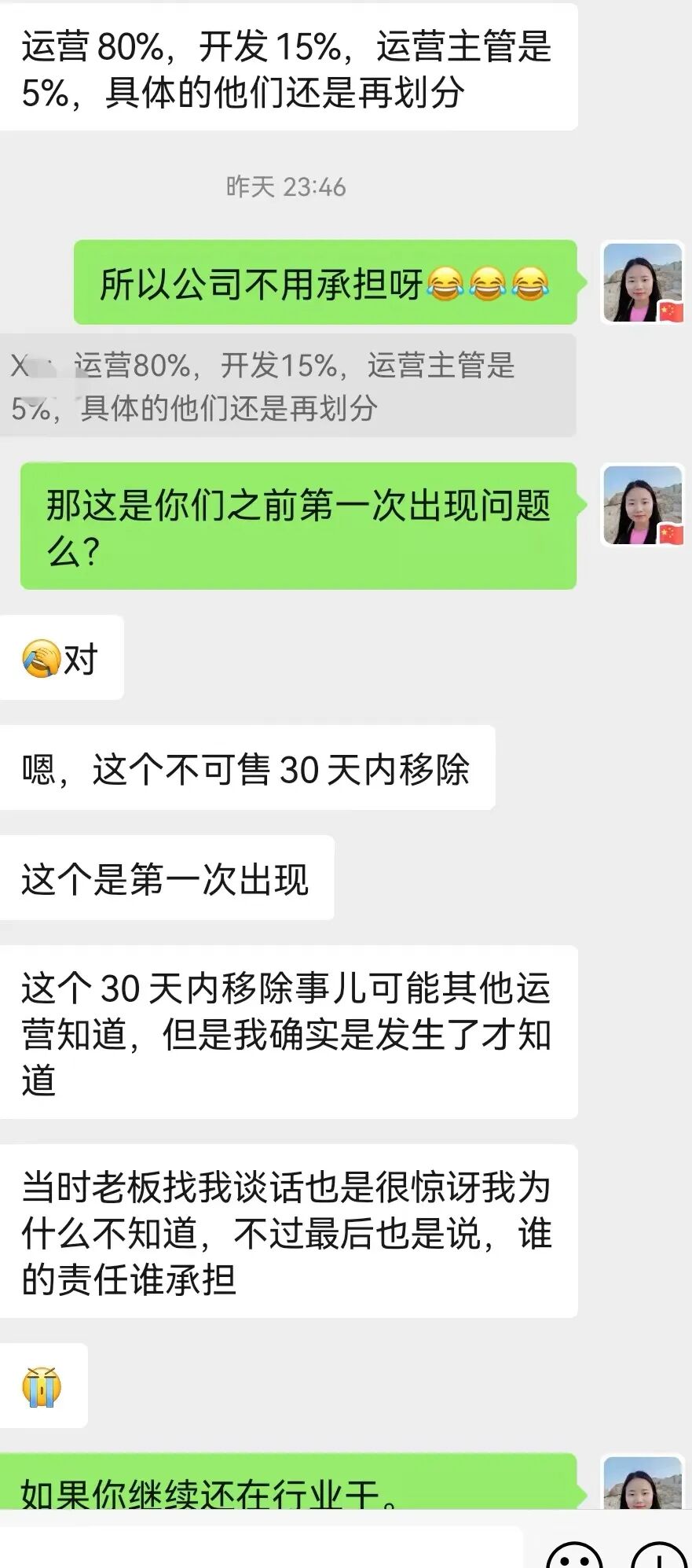 聊到具体需要承担的部分,说:运营80%,主管15%,产品开发5%。