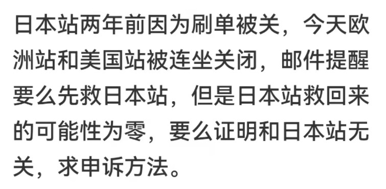 知无不言上的一位卖家发言:日本站两年前因为测评被关,现在欧洲站和美国站连坐被亚马逊关闭了,邮件提醒要么先救日本站,要么证明和日本站无关。