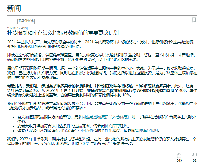 自2022年1月1日起,亚马逊美国站、英国站、欧洲站(德国/法国/意大利/西班牙)和日本站亚马逊物流仓储限制的库存绩效指标分数(IPI)阈值将降低至 400。