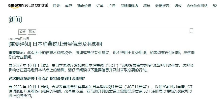 亚马逊后台在今天发布重要信息!自 2023 年 10 月 1 日起,由日本国税厅发起的日本消费税(“JCT”)“合规发票留存制度”改革将开始生效。这将会将影响卖家在亚马逊日本站点上的销售。