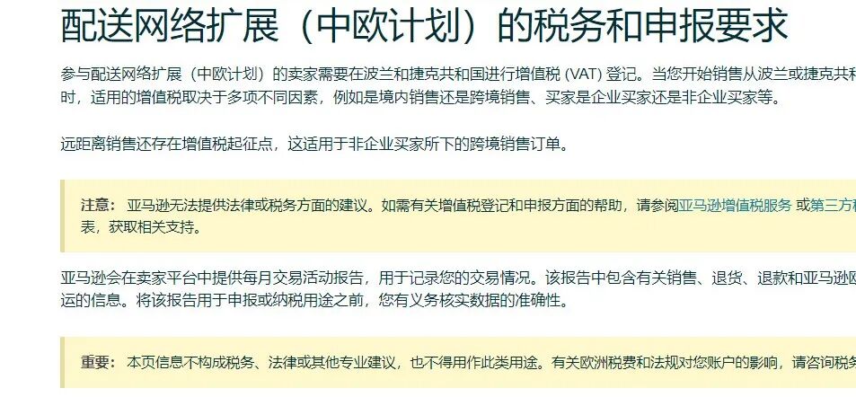 根据亚马逊官方消息,参与配送网络扩展(中欧计划)的卖家需要在波兰和捷克共和国进行增值税(VAT)登记。也就是说,即使卖家在亚马逊捷克和波兰没有站点,只要你参与了中欧计划,就需要注册这两个国家的VAT。