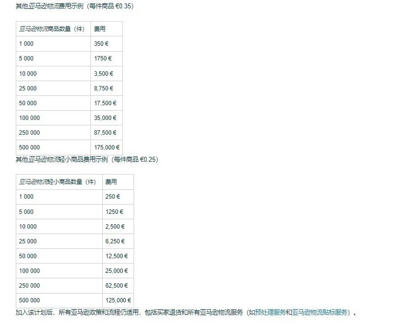 未通过加入配送网络扩展(中欧计划)授权亚马逊在亚马逊配送网络(包括波兰和捷克共和国)储存和处理德国亚马逊物流库存的卖家,需为从德国运营中心发货的每个亚马逊物流商品额外支付 €0.35 的配送费用,并为每件轻小商品支付 €0.25 的配送费用。