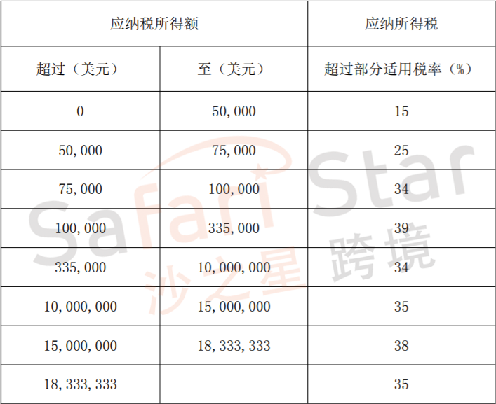 税率采用超额累进税率制度。其中最低税率为15%,年度应纳税额超过18,333,333美元的企业适用35%的统一比例税率(flat rate)。