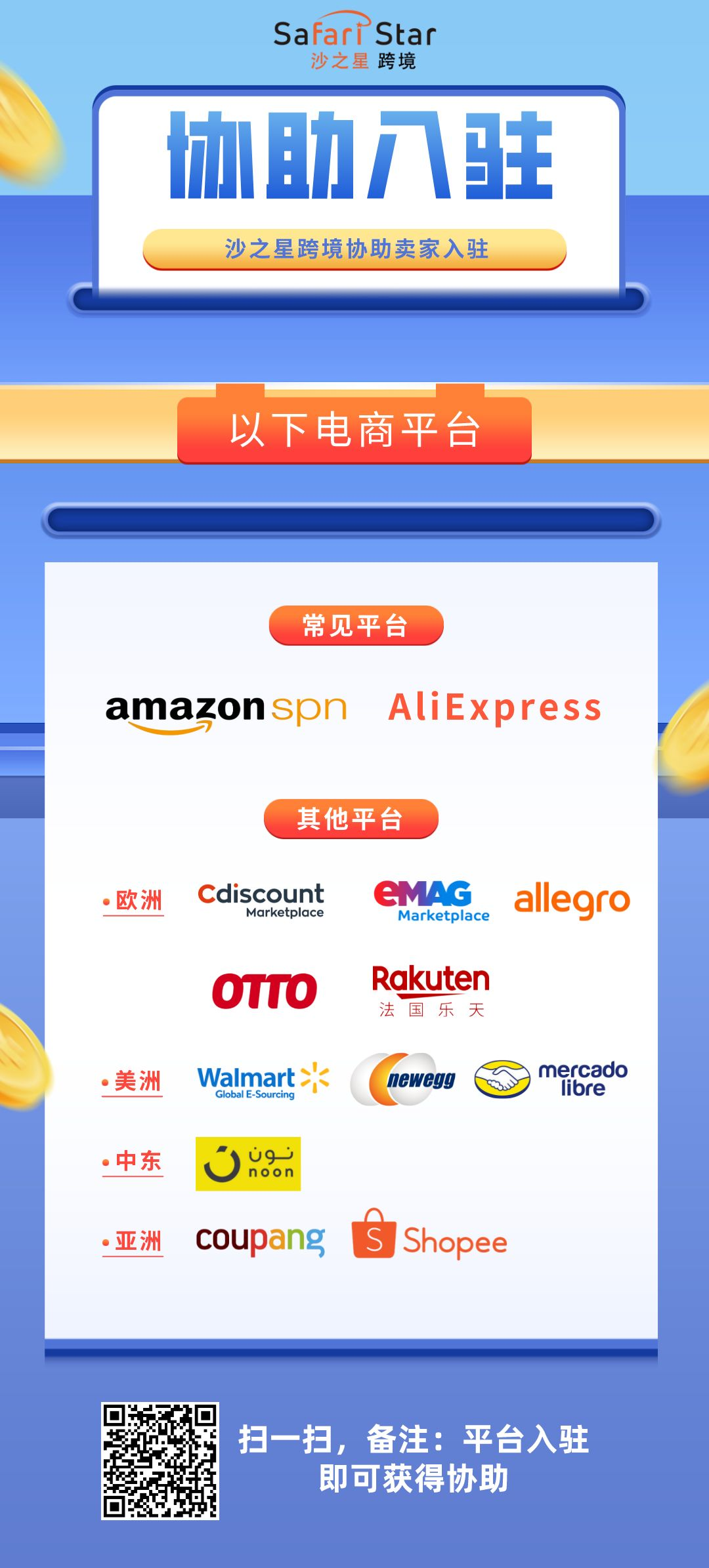近期沙之星跨境与亚马逊、沃尔玛、速卖通等众多跨境电商平台都达成合作关系,可以帮助卖家朋友进行入驻下列平台,对接招商经理: