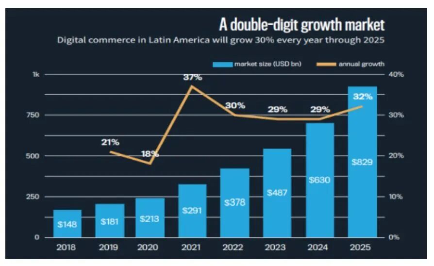 🔻相比欧美,拉美市场保持着较高的电商增长率——