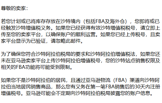 2022年3月24日,有亚马逊沙特站卖家向我们反馈收到了亚马逊官方邮件,要求卖家上传沙特增值税税号到卖家平台。邮件内容大致为: