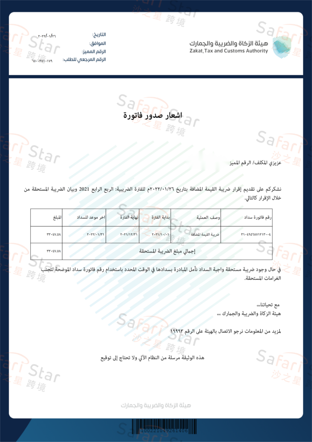 沙特VAT申报频率根据年应税销售额而定,并在申报周期的次月月底前(最后一天)完成报税和税金缴交。