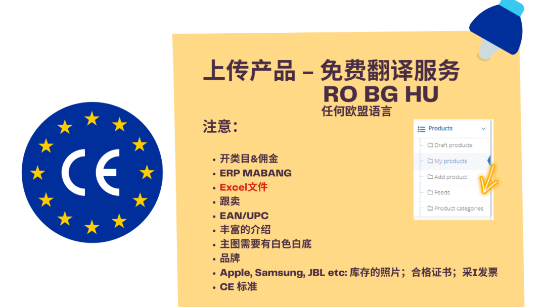 卖家可以提供英语。其他欧洲语言也可以(法语,意大利语,德语等等),eMAG有免费翻译服务。