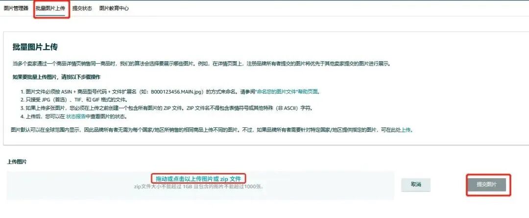 卖家平台——目录——“上传图片”——“批量上传图片”