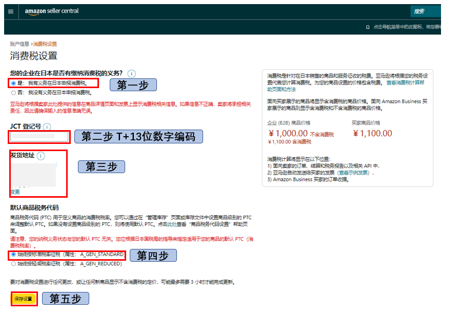 1️⃣第一步: 复制以下链接登录卖家平台, 或参照提交路径:卖家平台>设置>税务设置。在卖家平台的税务设置页面上选择 “是: 我有义务在日本申报消费税”