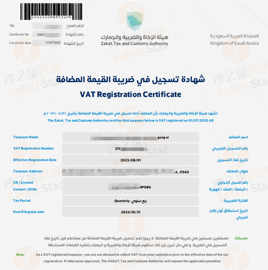 沙特卖家要特别注意第一次的申报时间,卖家会在沙特税局下发的VAT证书上看到。