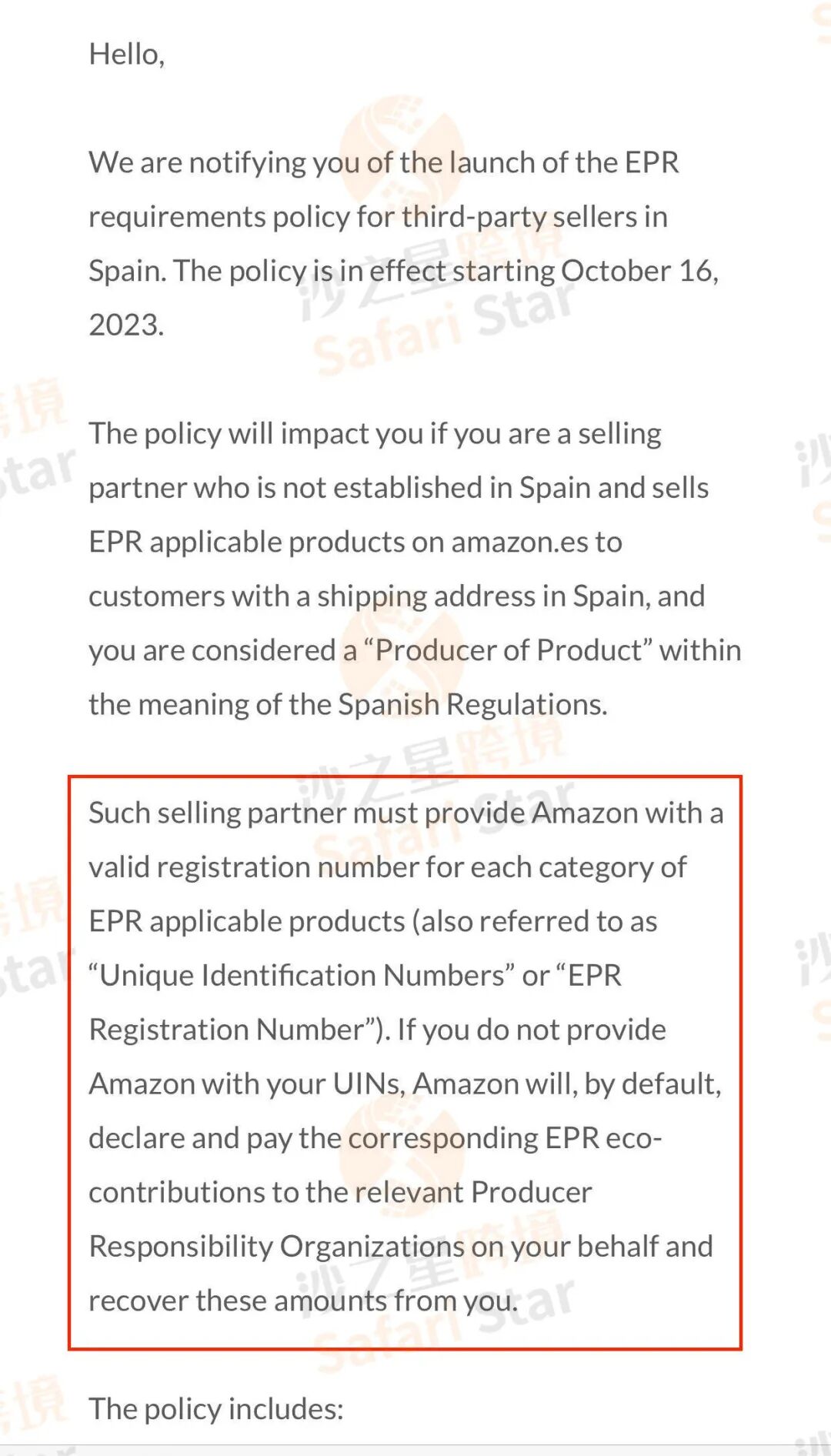 在2023年12月31日前提供有效西班牙包装法EPR注册号,否则亚马逊将进行代扣代缴!