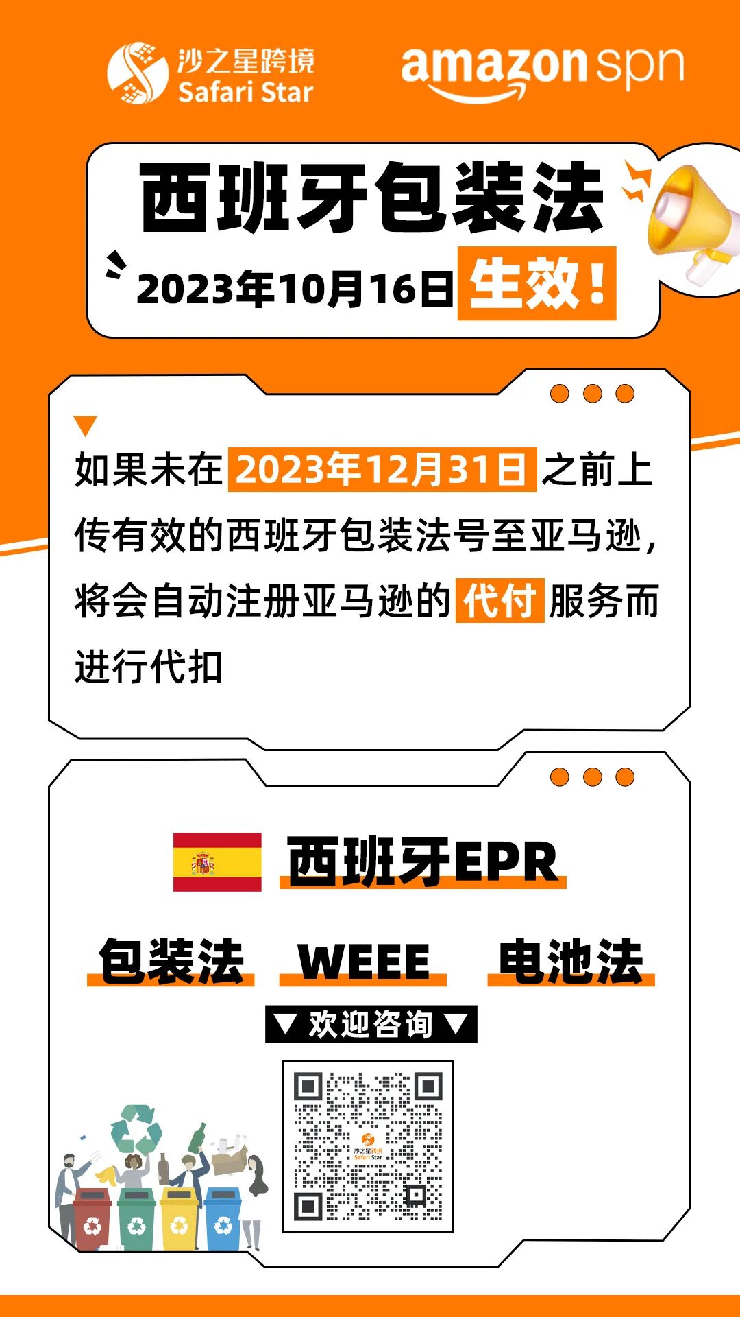 目前,需要注册西班牙包装法的卖家不用担心,沙之星跨境作为亚马逊EPR认证服务商,在欧洲设有本土自营办公室,可以帮助您进行西班牙EPR的注册和申报。扫描下方海报二维码,即可咨询注册条件,注册资料,注册时效等详情~