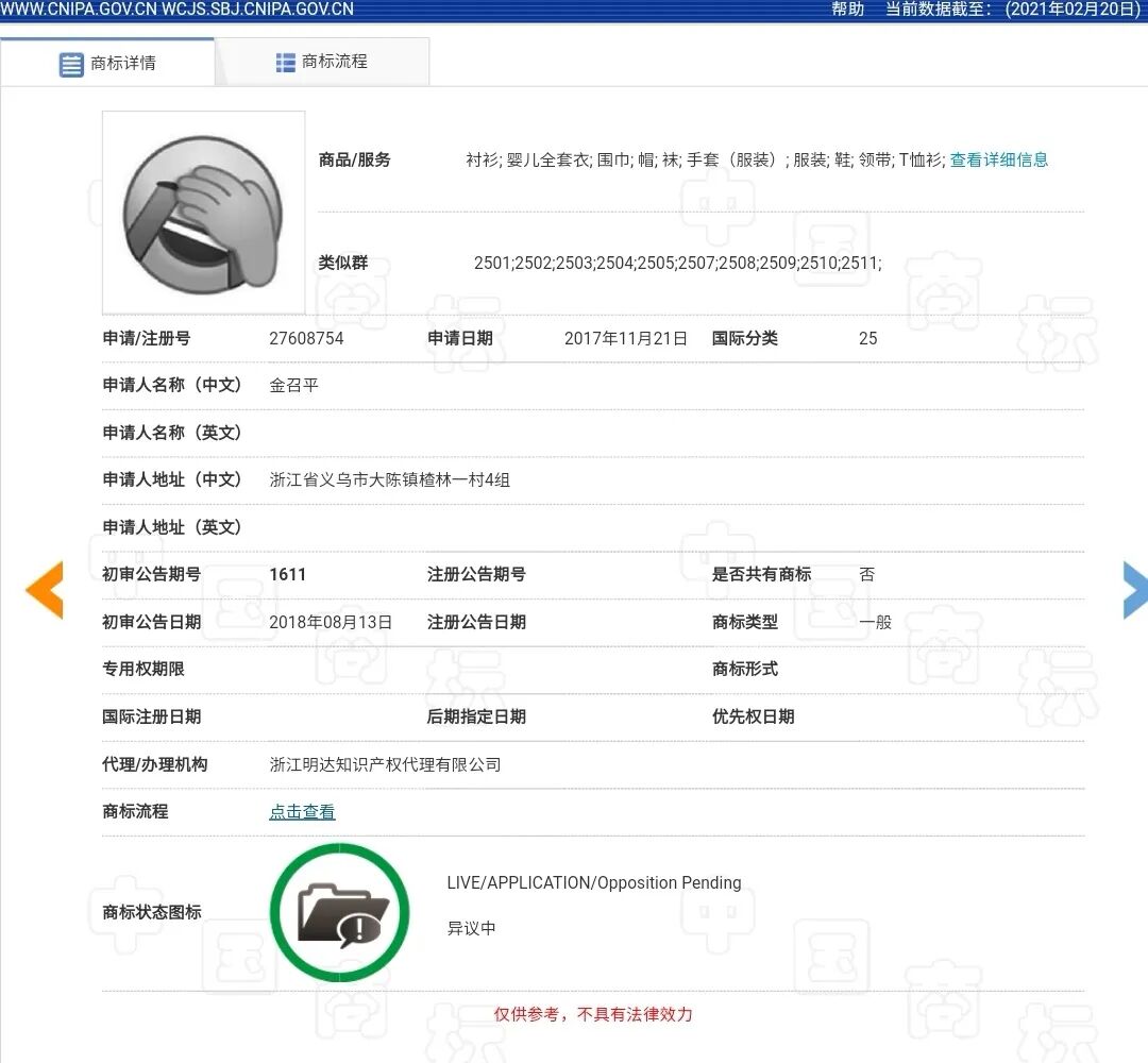 该商标的国际分类为25类,核定使用商品/服务项目包括:T恤衫;服装;衬衫;婴儿全套衣;鞋;帽;袜;手套(服装);领带;围巾等,并且当时已通过了商标初步审定,进入初步审定的公告阶段。