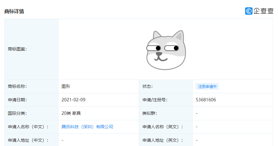 根据中国商标网的信息显示,今年2月初,腾讯科技(深圳)有限公司向国家知识产权局申请注册了多个 “狗头”表情包图形商标,国际分类为金属材料、方便食品、家具、布料床单、广告销售等,商标状态为 “注册申请中”。