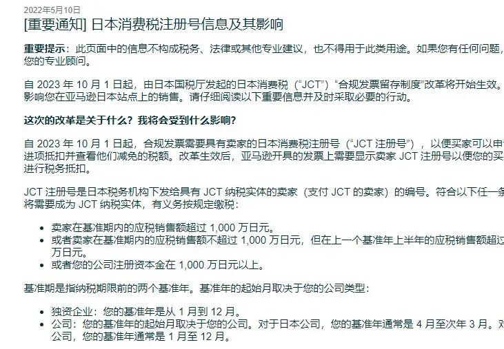 亚马逊在5.10日发布通知,要求需要开增值税发票的日本站卖家在2023年10月1日之前注册并上传日本消费税号(JCT注册号)。这一消息在我们沙之星跨境的日本卖家交流群里引起了不小的震动。如果你也想加入,可以扫描文章末尾二维码,我们将第一时间分享日本税务最新信息。