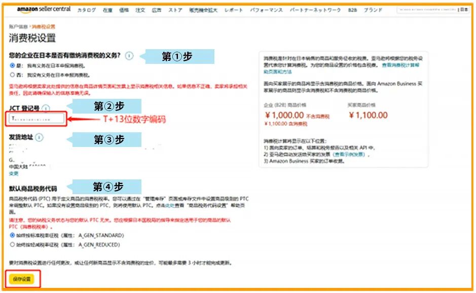 提交路径:卖家后台->设置->账户信息->税务信息->消费税设置->添加“JCT登记号”->点击“保存设置
