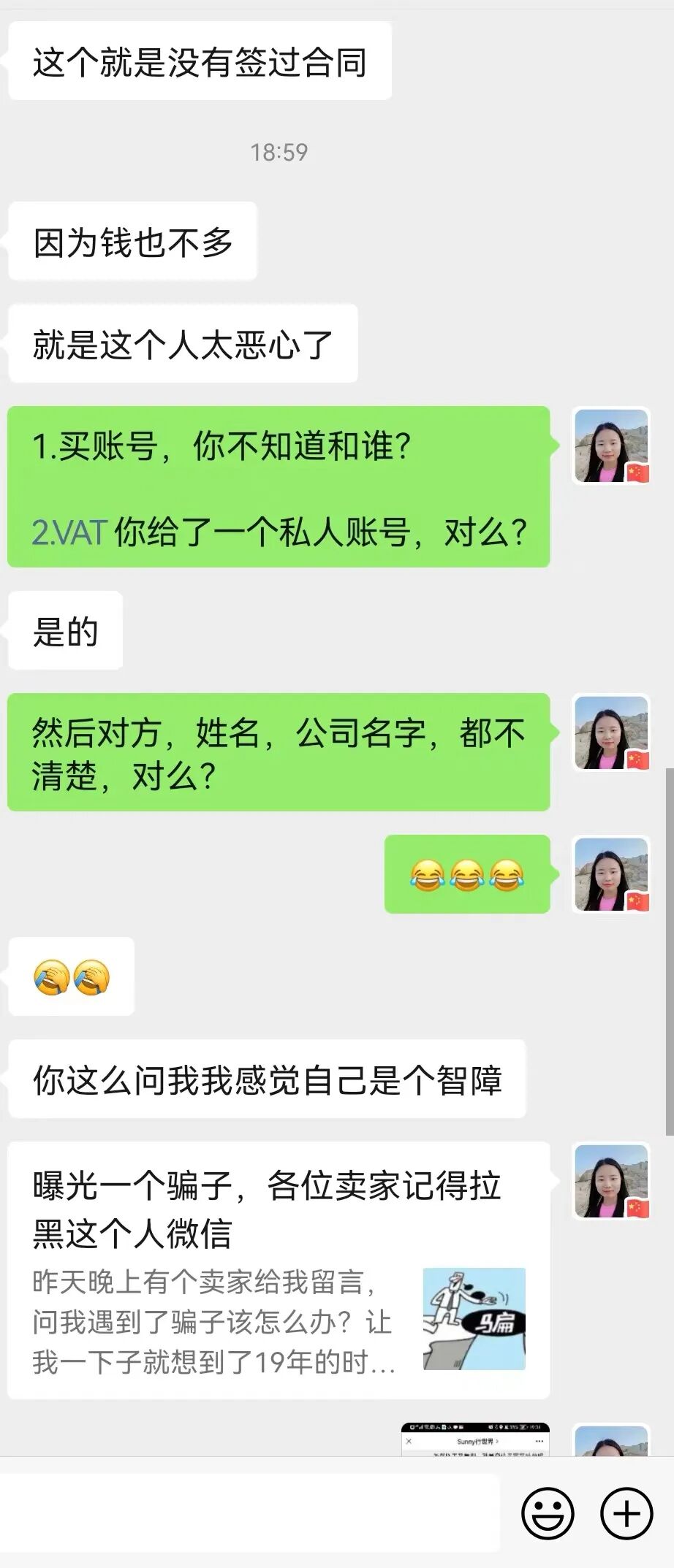 去年的3月5日,朋友圈中还有一个卖家,被当年同样骗我的这个微信号,继续被骗了,我发个链接,结果那个卖家说,就是这个同样的骗子。网络上最早发现被他骗了的记录,都可以追溯到2014年,能够坚持这么多年,都一直在跨境电商圈行骗,确实也是蛮有毅力的,这么多年,如果诚信干点啥不好呢?????????