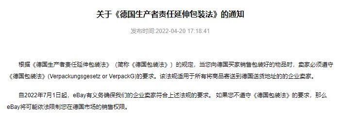 4月底,eBay平台在官方公众号发表声明:从2022年7月1日起,eBay有义务确保平台卖家符合德国包装法规的要求。对于不遵守《德包装法》要求的产品,eBay将依法限制其在德国市场的销售权限。