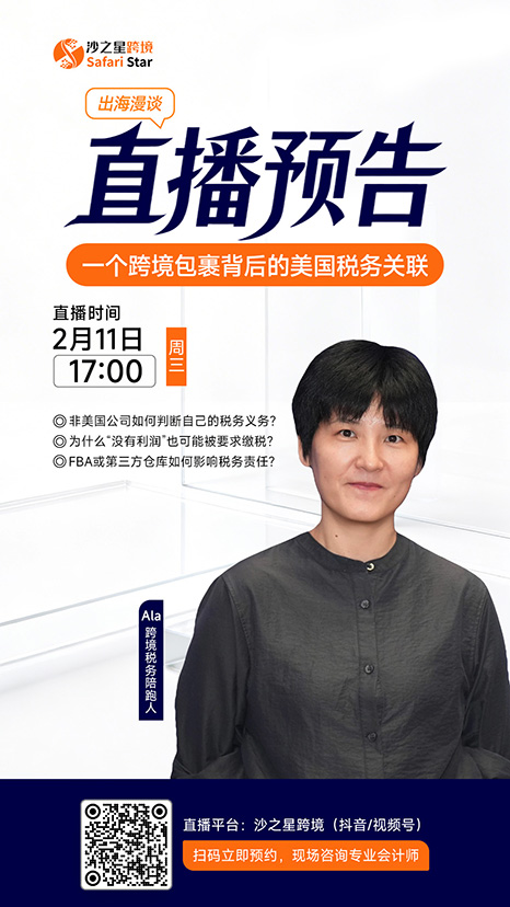 2月11日下午17:00,沙之星将围绕美国税局的实际判断路径,系统解析跨境企业在未设立美国实体的情况下,税务义务是如何被逐步识别与确认的。