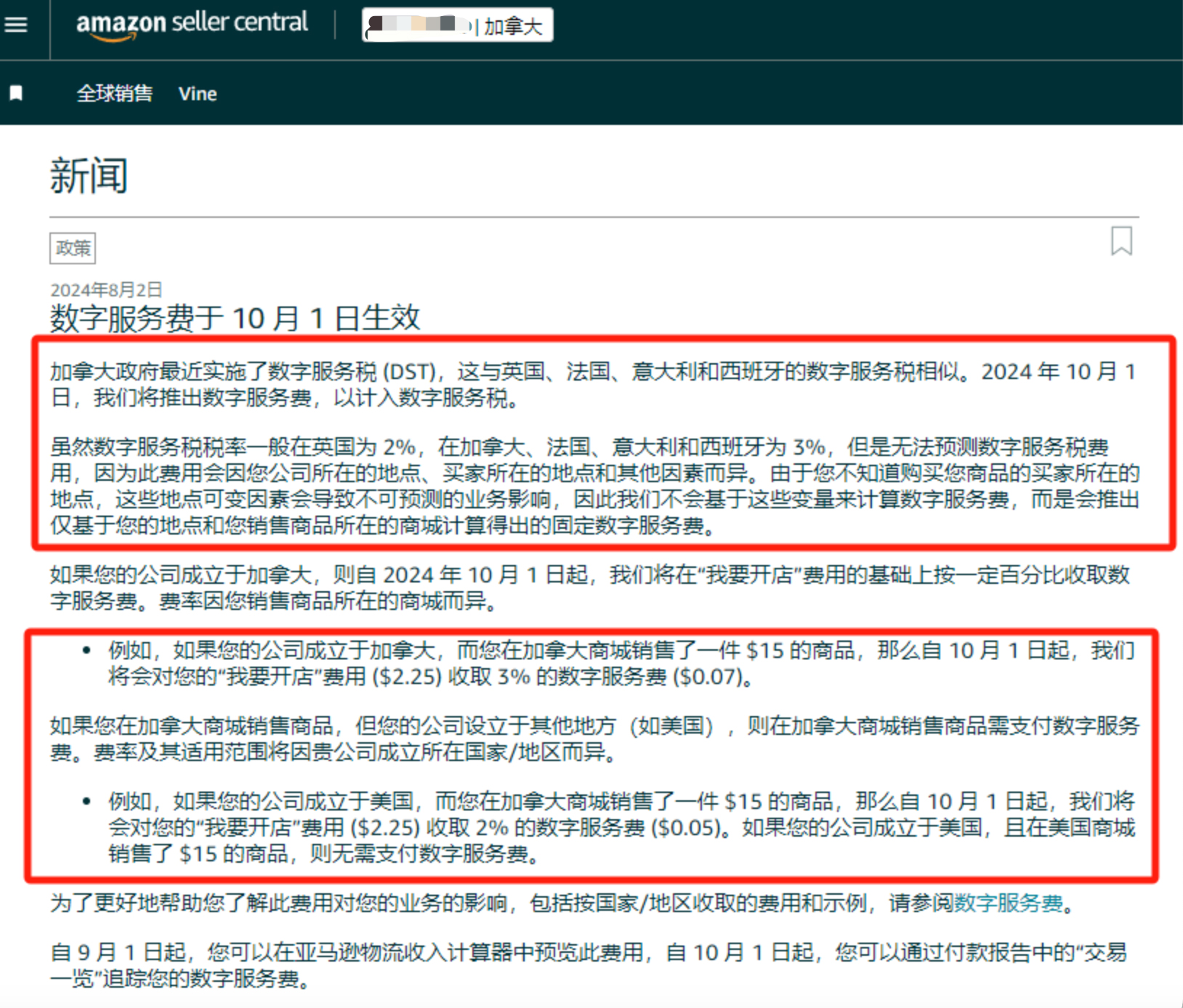 2024年10月1日,加拿大政府正式实施数字服务税(DST),亚马逊为应对此变化,将于10月1日起推出数字服务费,以帮助卖家适应新税收环境。