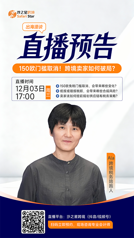 12月3日下午17:00,沙之星将深度解读政策变化的实际影响,并分享卖家可行的应对策略,助力跨境业务稳步前行。